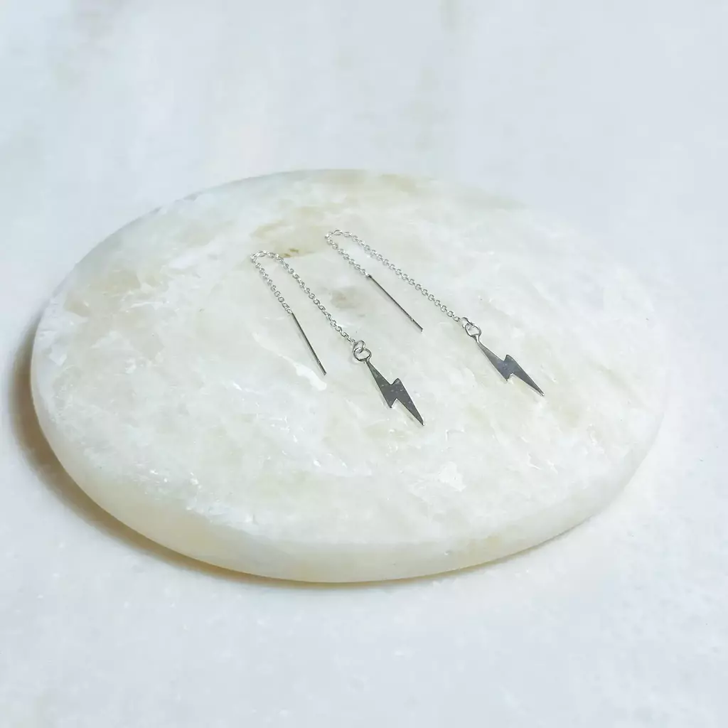 Aros Fossacesia: Un diseño moderno y vibrante en plata 925. Estos aros colgantes con cadena incorporan un elegante rayo con terminación pulida, que refleja la luz de manera única y aporta un toque de energía y estilo a tu look.