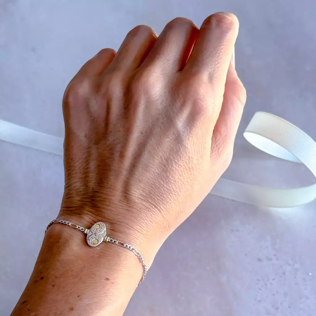 Pulsera Pitigliano: Esta pulsera confeccionada en plata 925 de alta pureza, que cautiva con su terminación pulida y un brillo incomparable. Su diseño se centra en un delicado óvalo con detalles de flores que resalta con exclusivos detalles en oro, símbolo de sofisticación y belleza natural.